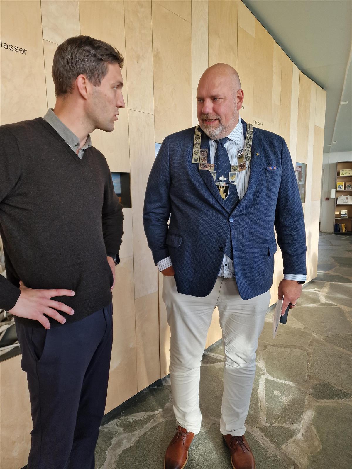 Guokte almmáiolbmo sagastallamiin. - Deaddil ja stuora govva ihtáDálkkádat- ja birasministtar Andreas Bjelland Eriksen ovttas fylkkasátnejođiheddjiin Hans-Jacob Bønå (O). Kristin Foosnæs
