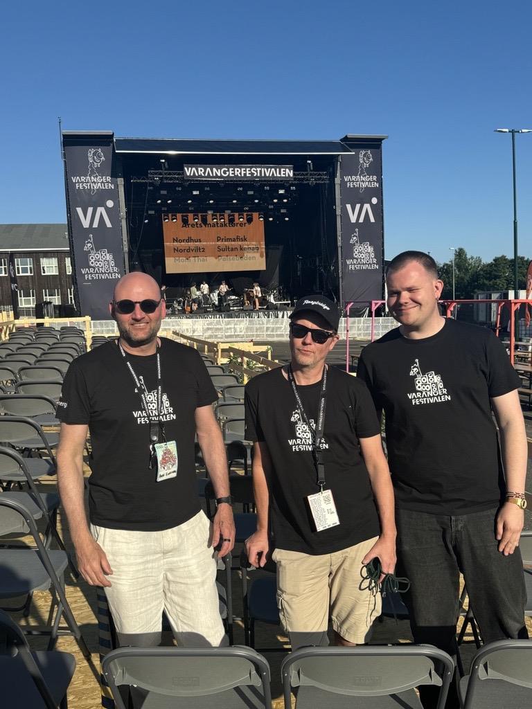 Festivalsjef André Kvernhaug (til venstre) sier at støtten fra FFK er helt avgjørende. Her står han sammen med produsent Andreas Sélen (midten) og produsentleder Sander Jakola (til høyre).