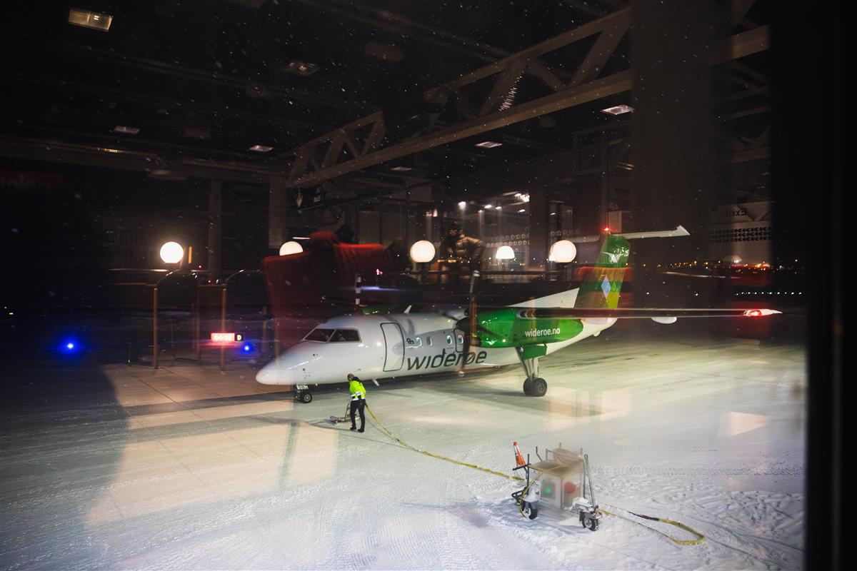 Et mindre propellfly fotografert på en liten flyplass. Bildet er tatt fra terminalen på vinterstid. - Klikk for stort bildeWiderøes ikoniske 39-seters De Havilland Dash 8-100/200, her fotografert på Hammerfest lufthavn. Flytypen har i flere tiår bundet småsteder og øysamfunn sammen med større byer i Norge. Sunniva Tønsberg Gaski/FFK