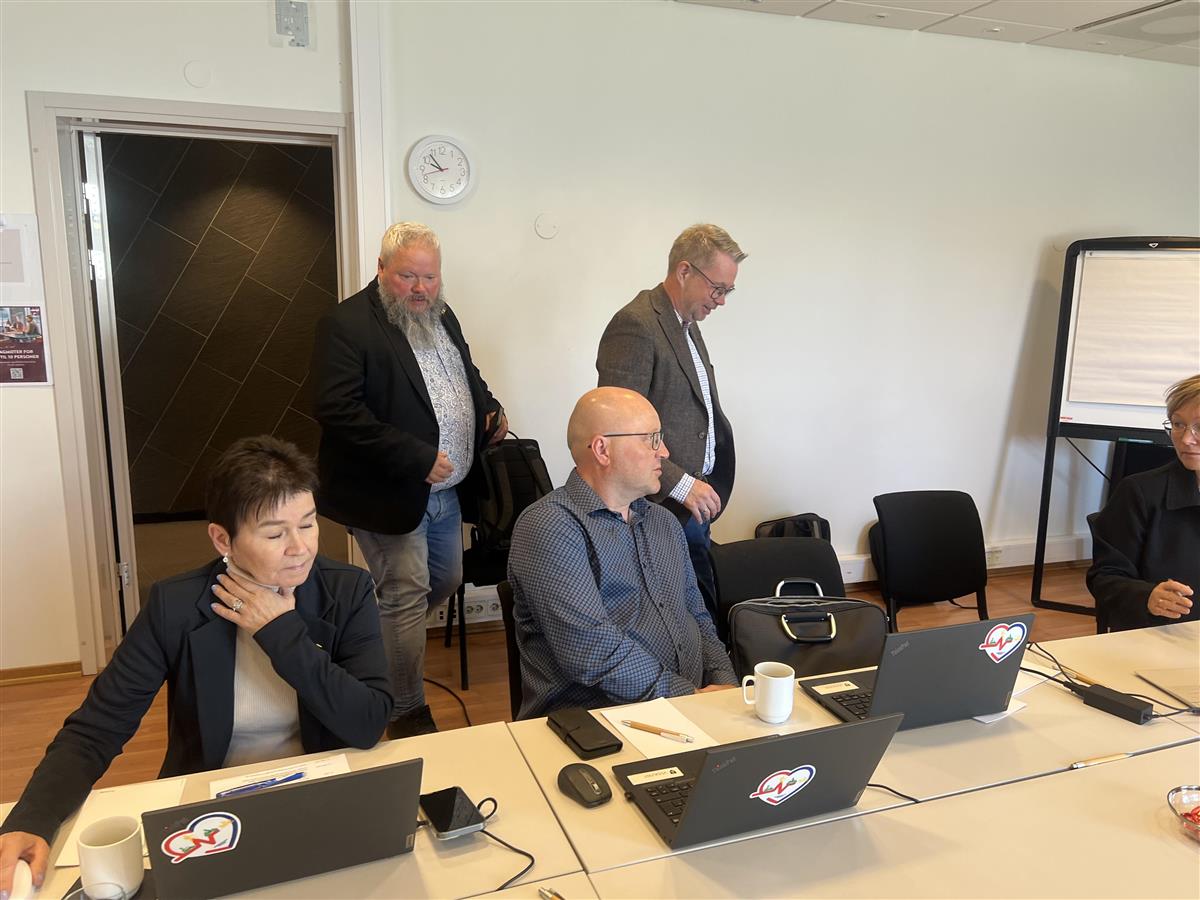 Arne Myrseth og Raymond Robertsen på vei inn til fylkesutvalgets møte. Tordis Opdahl og Thomas Mølmann sittende.