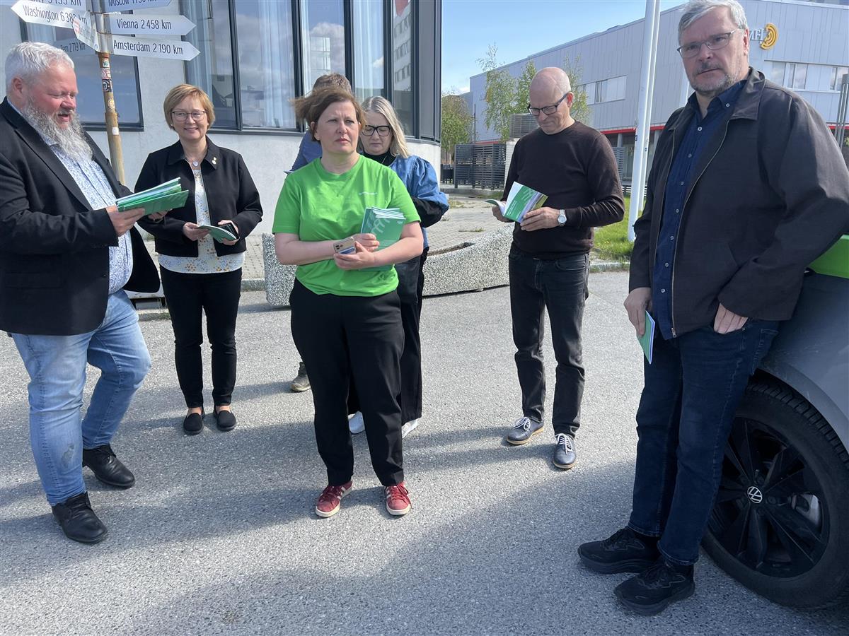Finnmark bondelag fikk møte fylkesutvalget i en pause. F.v.: Arne Myrseth, Heidi Holmgren, Helga Pedersen, Kristin Rajala, Hallgeir Strifeldt og Magne Ek.
