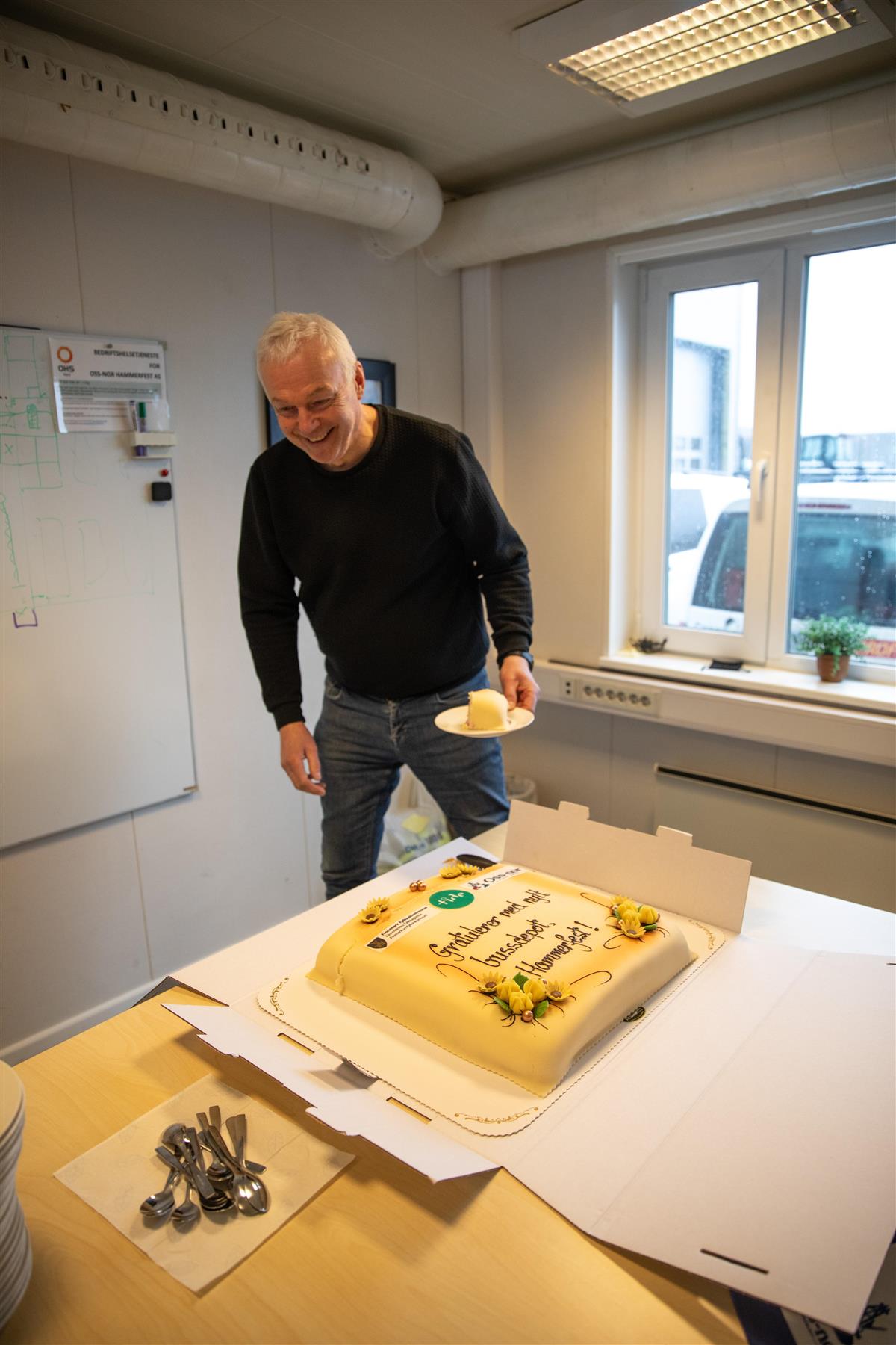 Leder for hovedutvalget for samferdsel (HUS), Terje Hansen (FrP), fikk ta første bit av kaka for anledningen!