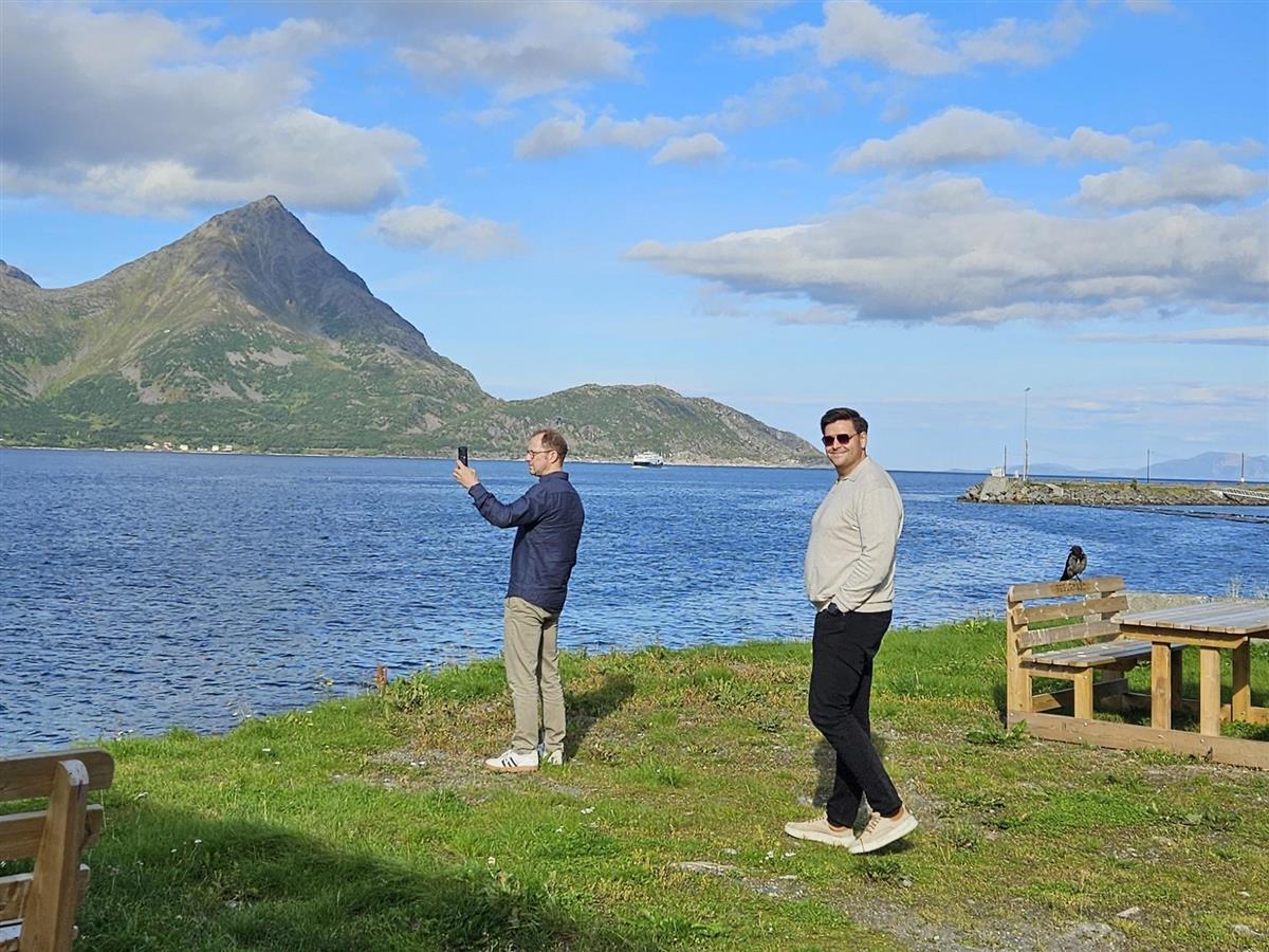 To menn nyter utsikten mot grønnkledde fjell, de står ved sjøen. - Klikk for stort bildeSeksjonsleder for strategi og anskaffelser i samferdselsavdelinga, Henrik Pietilæ (til venstre) og seksjonsleder for utbygging, Vidar Andersen, nyter Loppa! Jørgen Blix/FFK