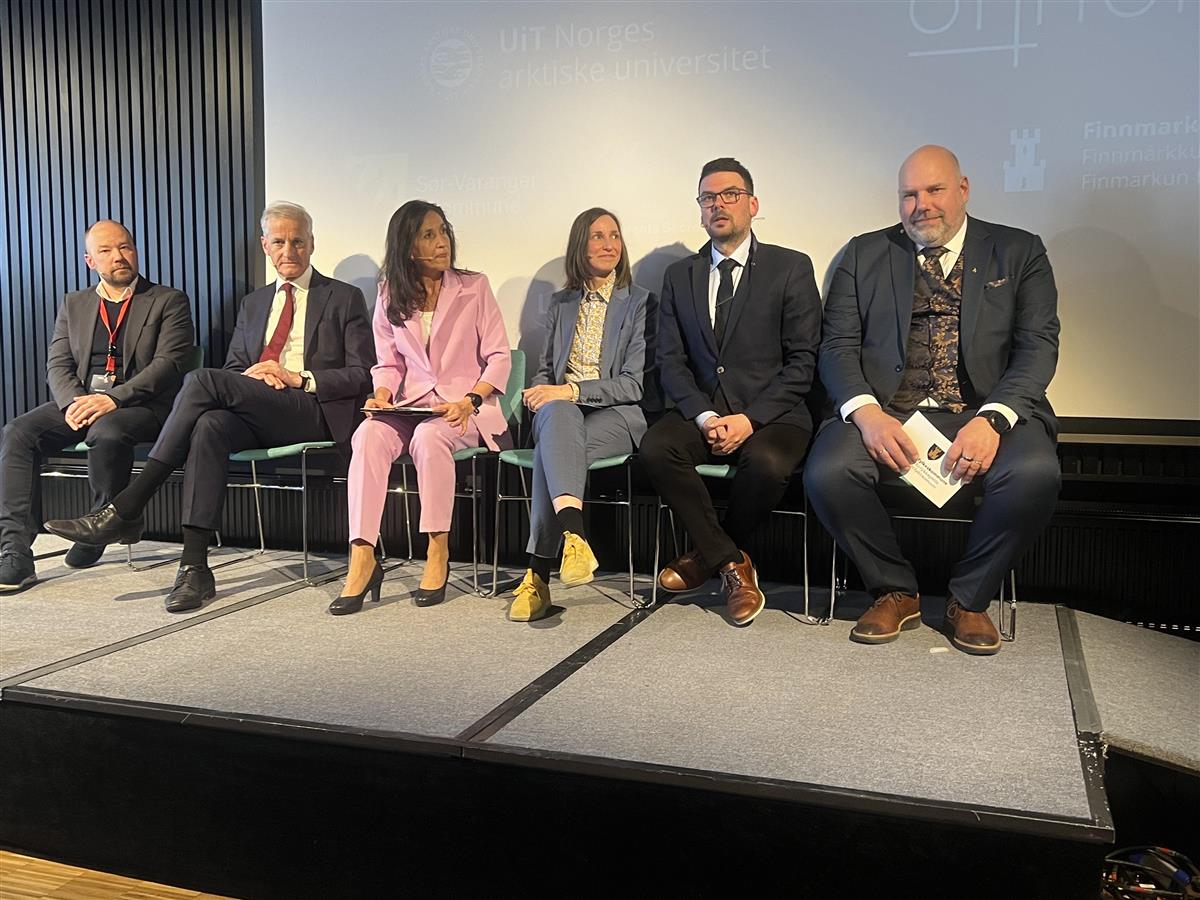 Fylkesordfører Hans-Jacob Bønå (t.h.) nevnte lavere skatt i Finnmark i paneldebatt med f.v.: Andreas Haugen i Avju Solutions, statsminister Jonas Gahr Støre, konferanseleder Siri Lill Mannes, Sparebank! Nord-Norge-sjef, Sør-Varangers ordfører Magnus Mæland.