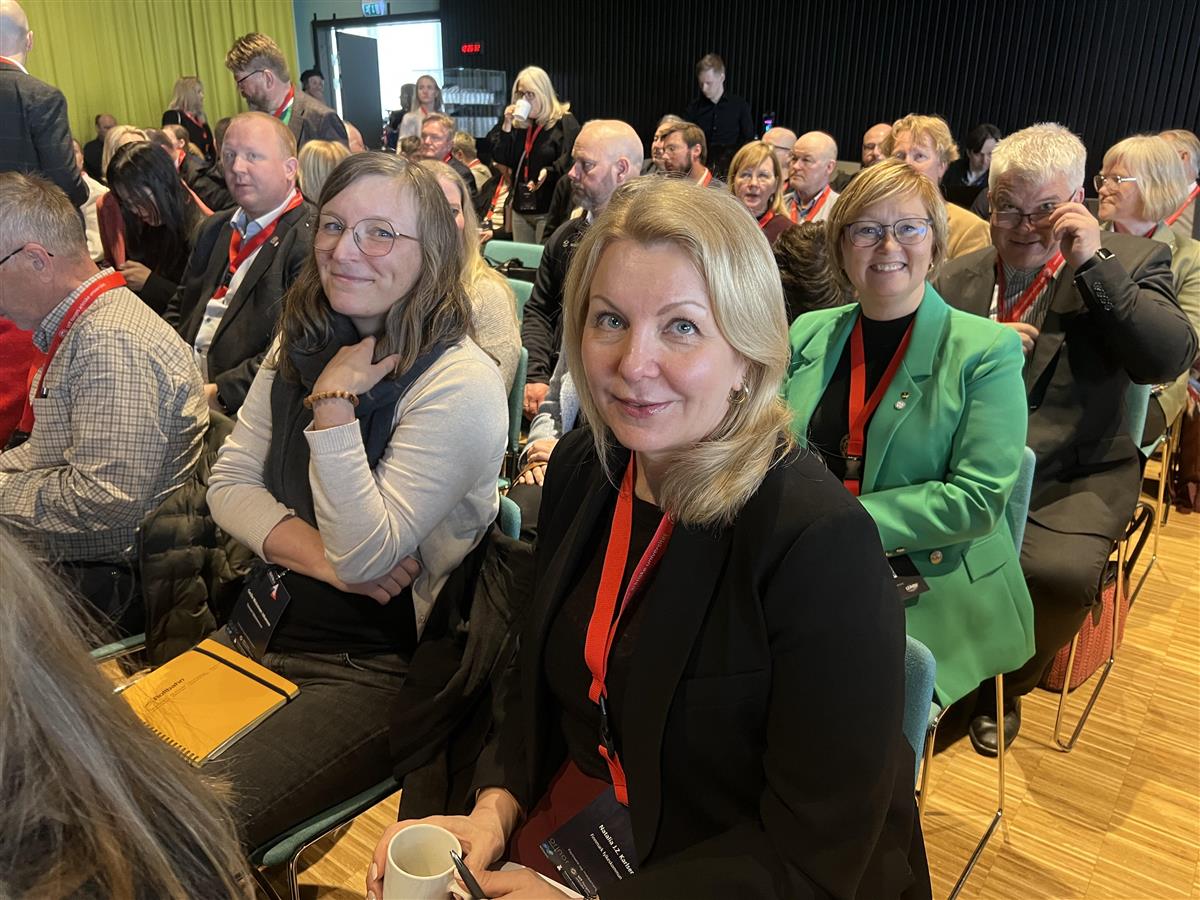 Cecilie Wickstrøm Johansen og Natalia Karlsen er på konferansen, og fylkesvaraordfører Heidi Holmgren bak.