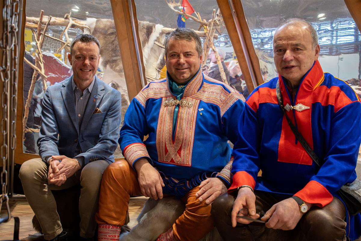 BESØK: Mikkel Isak Eira (H) var Finnmark fylkeskommunes offisielle representant i Berlin. Her sammen med fylkestingspolitiker i Troms, Håkon Vahl (H), og Ailu Utsi i Davvi Siida.