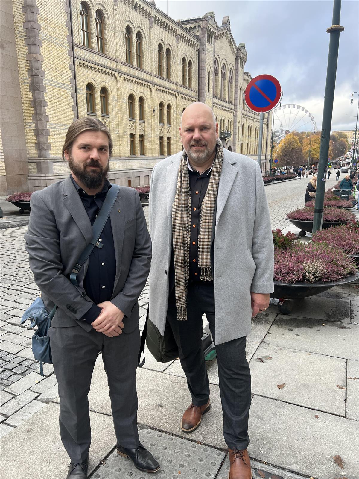 Økonomisjef Ole Stian Søyseth Benum og fylkesordfører Hans-Jacob Bønå møtte Stortingets kommunalkomite.