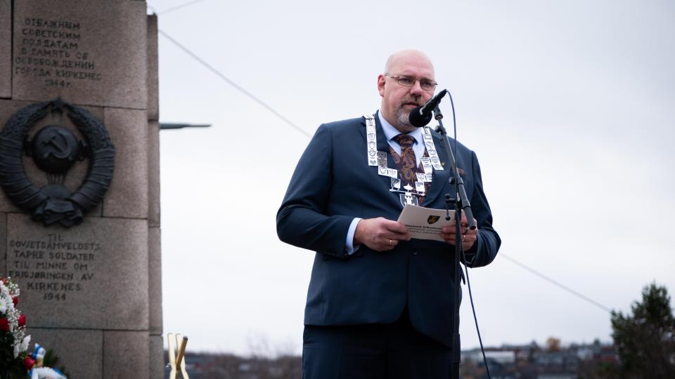 Verdig markering av frigjøringsjubileet Fylkesordfører Hans-Jacob Bønå la ned krans til minne om frigjøringen av Finnmark. Publisert 25.10.2024 kl. 14.15