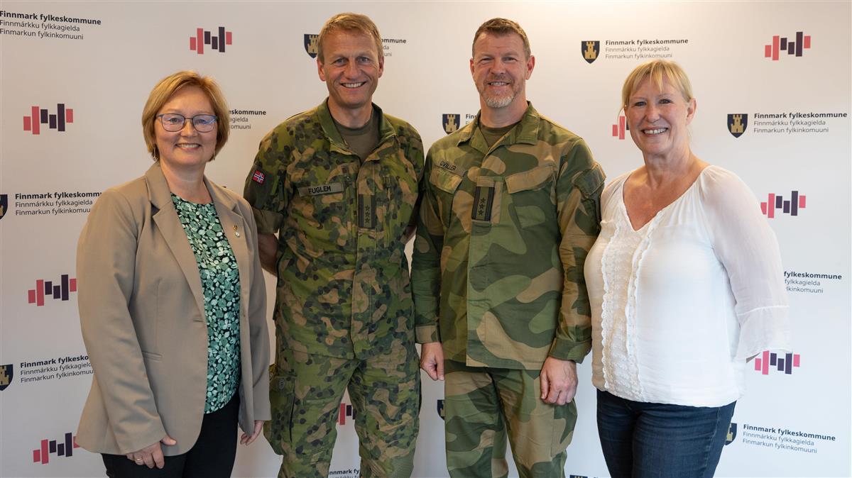 Heidi Holmgren og Heidi Brandt på hver sin side med Forsvaret i midten - Klikk for stort bildeFv: Heidi Holmgren - fylkesvaraordfører, John Olav Fuglem-påtroppende sjef Finnmarksbrigaden, Jørn Qviller – avtroppende sjef Finnmark landforsvar, Heidi Brandt – konstituert fylkeskommunedirektør. Chand Deep Kardey