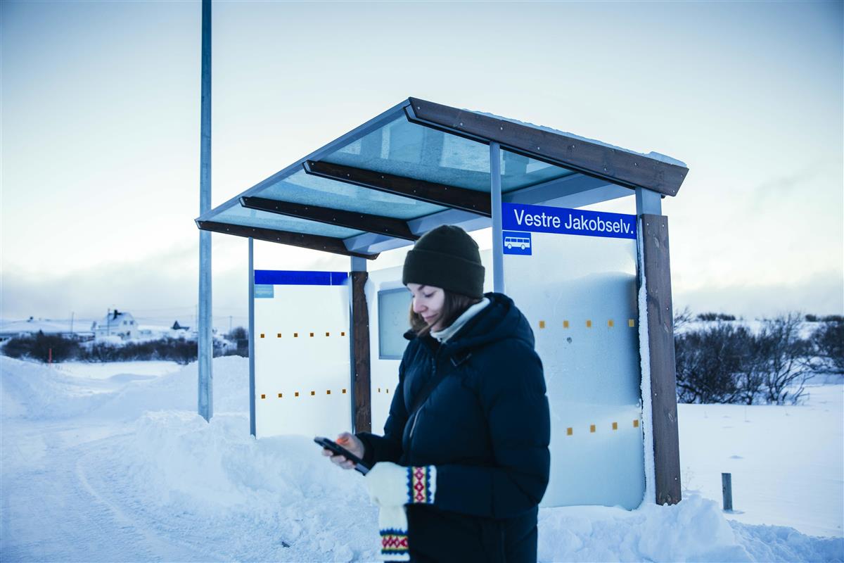 Illustrasjonsfoto: passasjer venter på buss i Vestre Jakobselv, Vadsø kommune.