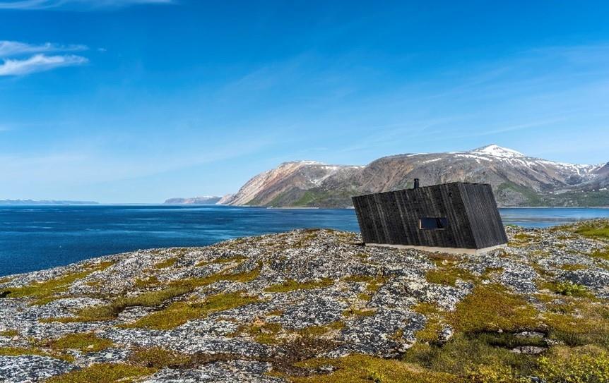 Hytte på bergfjell med hav i bakgrunnen. - Klikk for stort bildeDagsturhytta ved Koppmollbukta, Gávesluokta i Tana kommune. Finnmark friluftsråd
