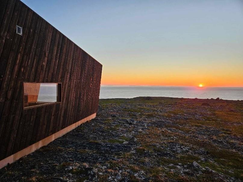 Hytte på bergfjell med hav i bakgrunn og solnedgang. - Klikk for stort bildeDagsturhytta på Storhåen, Hasvik Finnmark friluftsråd