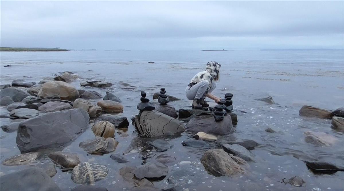 Dame sitter på huk på steiner i strandkanten mens hun bygger tårn av steiner rundt seg. - Klikk for stort bildePerformence av Ingeborg Wie Henriksen.