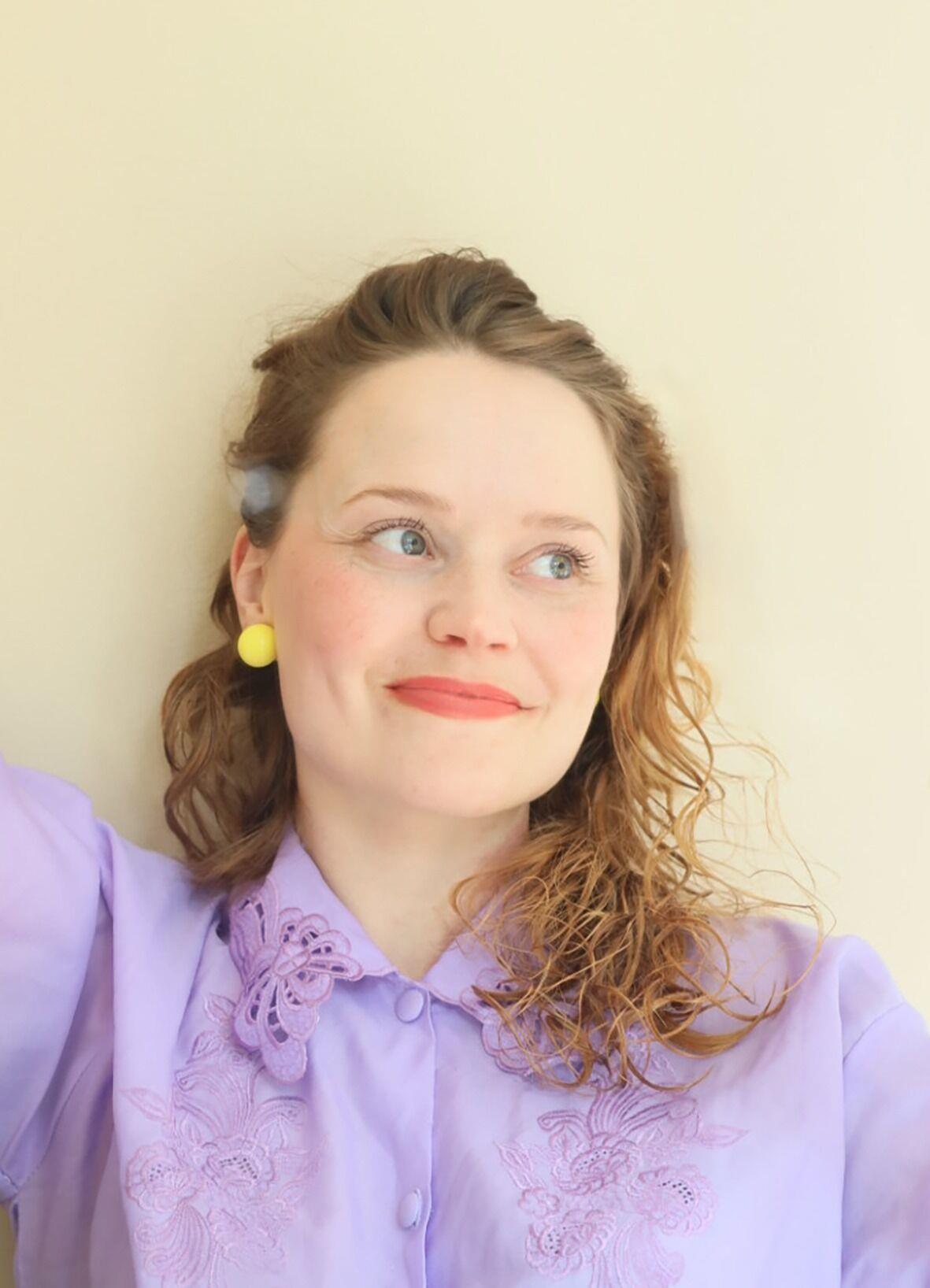 Dame med fargerike klær og øredobber smiler og ser til siden. - Klikk for stort bildeGjesteatelieret i Vadsø får besøk av Jonna Jylhä (41) fra Finland.