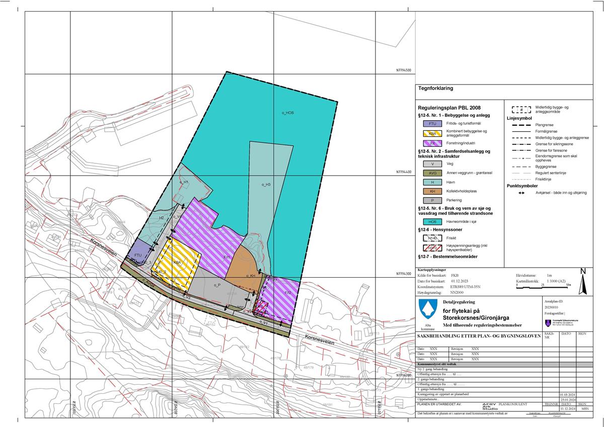 Høring: Forslag til detaljregulering for flytekai på Storekorsnes i Alta kommuneFinnmark fylkeskommune legger, i samarbeid med Alta kommune, ut forslag til detaljregulering for flytekai på Storekorsnes til høring og offentlig ettersyn. Høringsfrist er 5. februar 2025.Den nye flytekaien med tilhørende infrastruktur foreslås plassert øst for det eksisterende kaianlegget. Planområdet er illustrert på tegningen nedenfor.Plankart for detaljregulering av flytekai på StorekorsnesPlandokumenterPlanbeskrivelse (PDF, 2 MB)Planbestemmelser (PDF, 163 kB)Plankart (PDF, 495 kB) Andre vedleggReferat fra oppstartsmøte med Alta kommune (PDF, 217 kB)Merknadsbehandling etter varsel om oppstart samt referat fra åpent møte (PDF, 2 MB)Multiconsult 2016 - Grunnundersøkelser for Kystverket (PDF, 7 MB)Multiconsult 2022 - Alternativer for ny hurtigbåtkai (PDF, 4 MB)Multiconsult 2024 - bølgeanalyse for Storekorsnes (PDF, 5 MB)AFRY 2024 - Skisseprosjekt K1 (PDF, 2 MB)AFRY 2024 - miljøkartlegging av sjøsedimenter (PDF, 8 MB)AFRY 2024 - miljøteknisk grunnundersøkelse (PDF, 8 MB)AFRY 2024 - VAO-notat (PDF, 880 kB)AFRY 2024 - Geoteknisk prosjekteringsrapport (PDF, 2 MB)Ecofact 2024 - marint naturmangfold (PDF, 807 kB)Ecofact 2024 - terrestrisk naturmangfold (PDF, 3 MB)Geonord 2024 - Datarapport for grunnundersøkelser (PDF, 3 MB)Risiko- og sårbarhetsanalyse - detaljregulering for flytekai på Storekorsnes (PDF, 333 kB)AFRY-efterklang 2024 - Støyvurdering (PDF, 751 kB)Send innspillEventuelle merknader til planforslaget sendes til postmottak@ffk.no, eller til Finnmark fylkeskommune, Postboks 701, 9815 Vadsø innen 5. februar 2025. Vennligst merk høringsuttalelsen med referansenr. 23/04882 Publisert 05.02.2025 00.01 Sist endret 16.12.2024 14.07