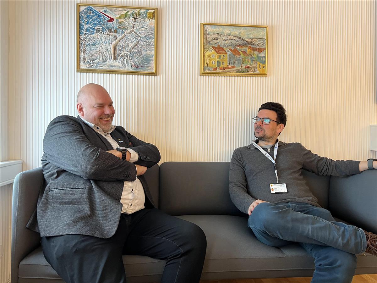 To menn sitter i en sofa, de smiler under samtalen. - Klikk for stort bildeF.v.: fylkesordfører Hans-Jacob Bønå (H) og ordfører i Sør-Varanger kommune, Magnus Mæland (H). Helén Andersen/ FFK