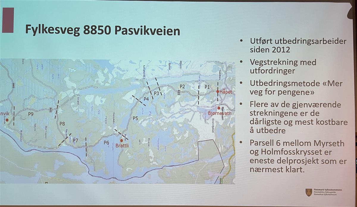 Byggeleder Torbjørn Svendsen på samferdselsavdelinga orienterte om veiarbeid som skal gjøres på Sandnes (på vei mot Pasvik), som også er ressurskrevende. Samferdselssjef Jørgen Blix kunne fortelle at av 1500 kilometer med fylkesveier, så skal 22 av disse kilometerne asfalteres.