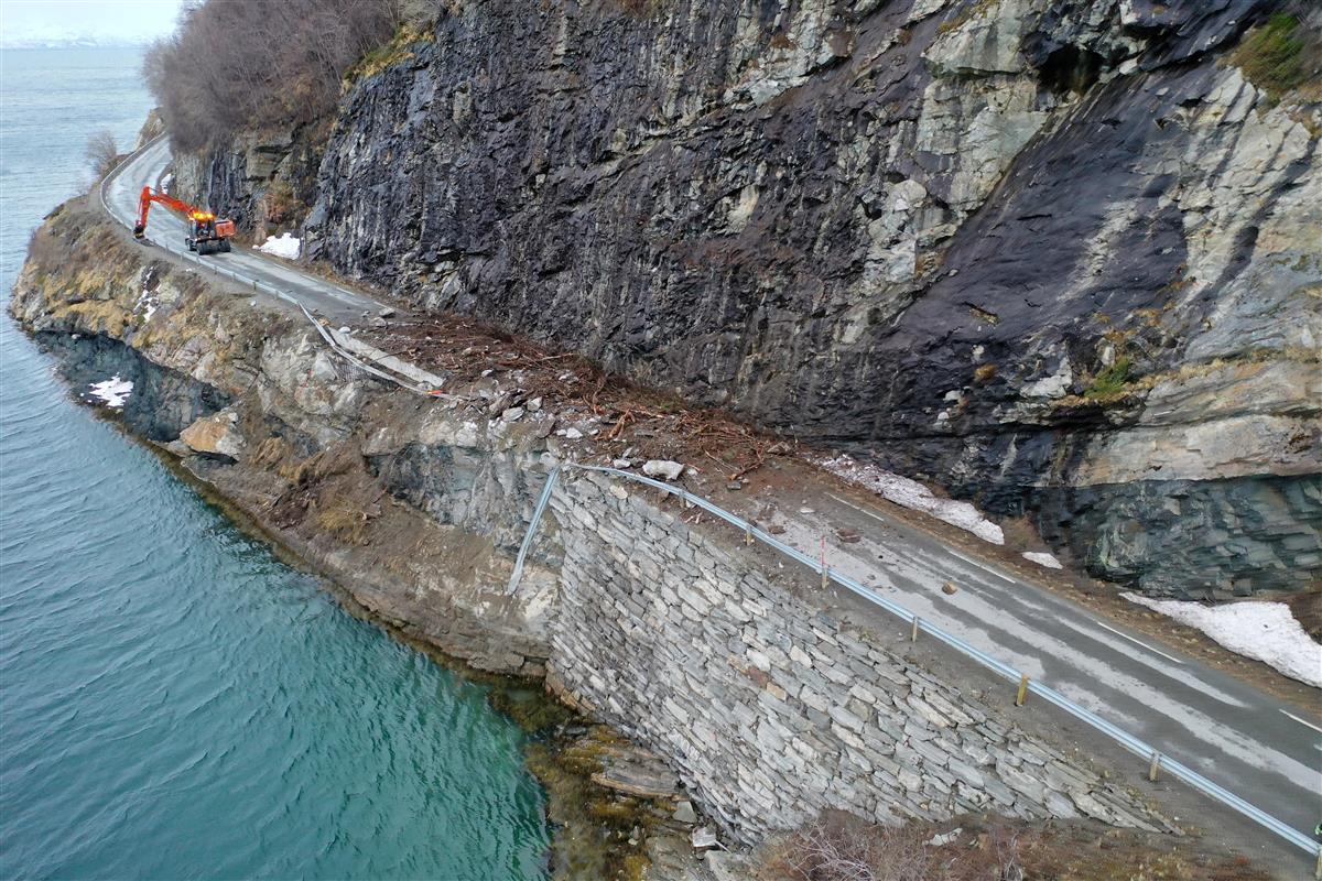 En vei mellom fjell og hav som er fotografert fra lufta. Deler av strekningen er ødelagt etter skred. Man kan se en gravemaskin lenger ned i veien. - Klikk for stort bildeSkred i Skillefjord nord, langs fv. 8830 i Alta. Trond Jøran Nilsen Hinlo/FFK