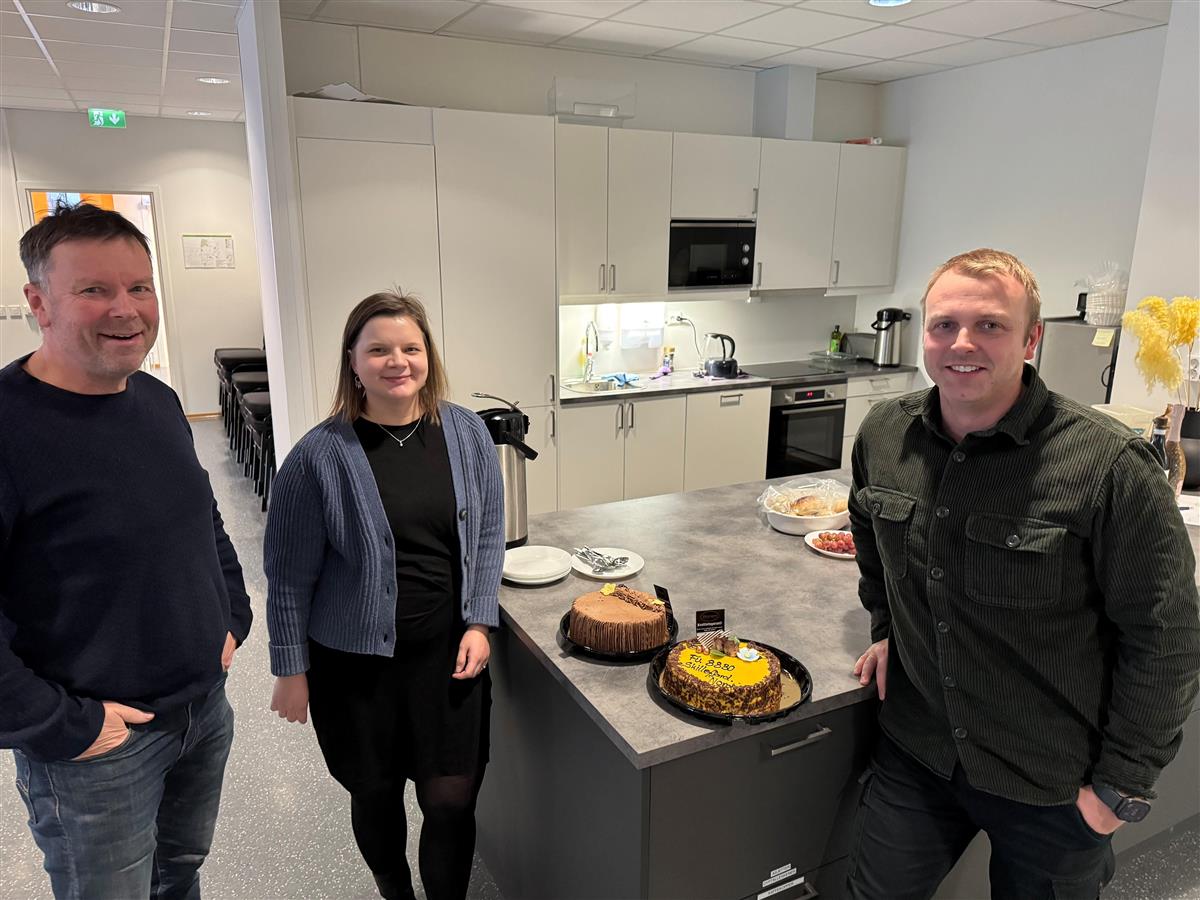 Tre mennesker står på et kjøkken i et kontorlandskap. På bordet står det et par kaker. De smiler til kamera. - Klikk for stort bildeDet ble markering av utlysningen av prosjektet torsdag 20. november på Alta-kontoret. F.v.: prosjektleder Oddbjørn Opgård, ingeniørgeolog/skredsakkyndig Anne-Marte Hansen og spesialrådgiver ingeniørgeologi og skred, Trond Jøran Nilsen Hinlo. Vidar Andersen/FFK