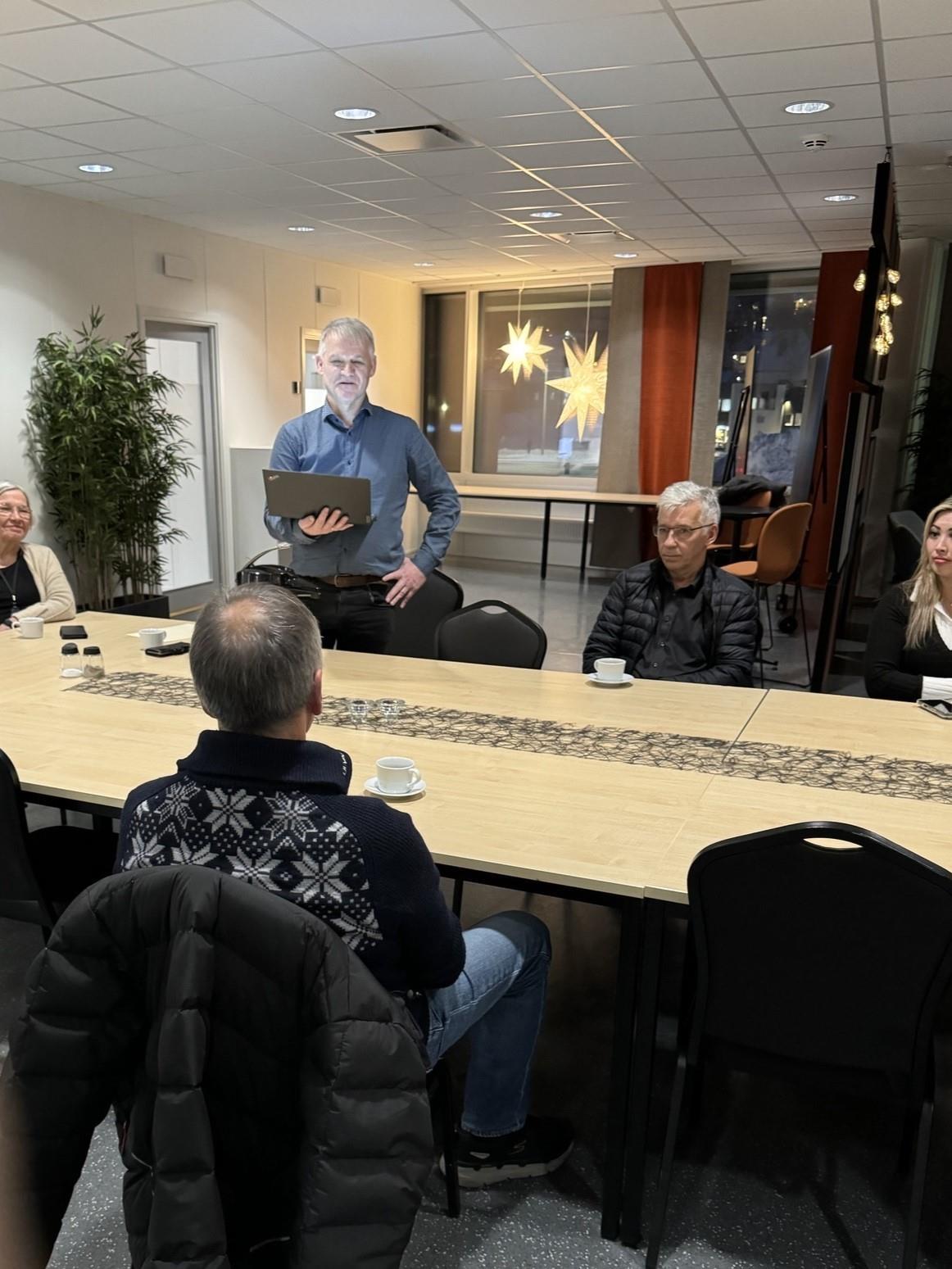 En mann står å holder en tale ved et bord, det er flere mennesker som sitter ved bordet. - Klikk for stort bildeLeder for Hovedutvalget for samferdsel (HUS), Odd Erling Mikalsen (FrP), tildeler prisen. Alfred Henrik Pietilæ/ FFK