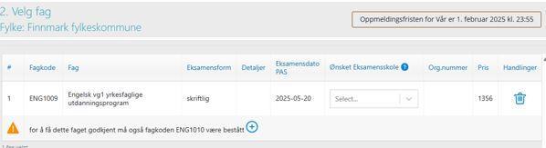 Merk at skriftlig, muntlig, muntlig-praktisk eller praktisk eksamen i samme fag har ulike fagkoder og du må betale for hver eksamen. I fag som krever flere eksamener, trenger du ikke ta alle i samme eksamensperiode.